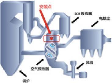 脱硝广泛的应用于电力、钢铁、石化等行业中。 选择性催化还原法 (SCR) 除去氮氧化物是脱硝过程应用极多的方法。此方法的化学反应原理为在原烟气中喷入氨,在催化剂的作用下, NH3 与 NO 和 NO2 反应生成 H2O和 N2。废气中过量的氨被称作逃逸氨。逃逸氨的测量被用来控制脱硝工艺,安装点如右图所示。